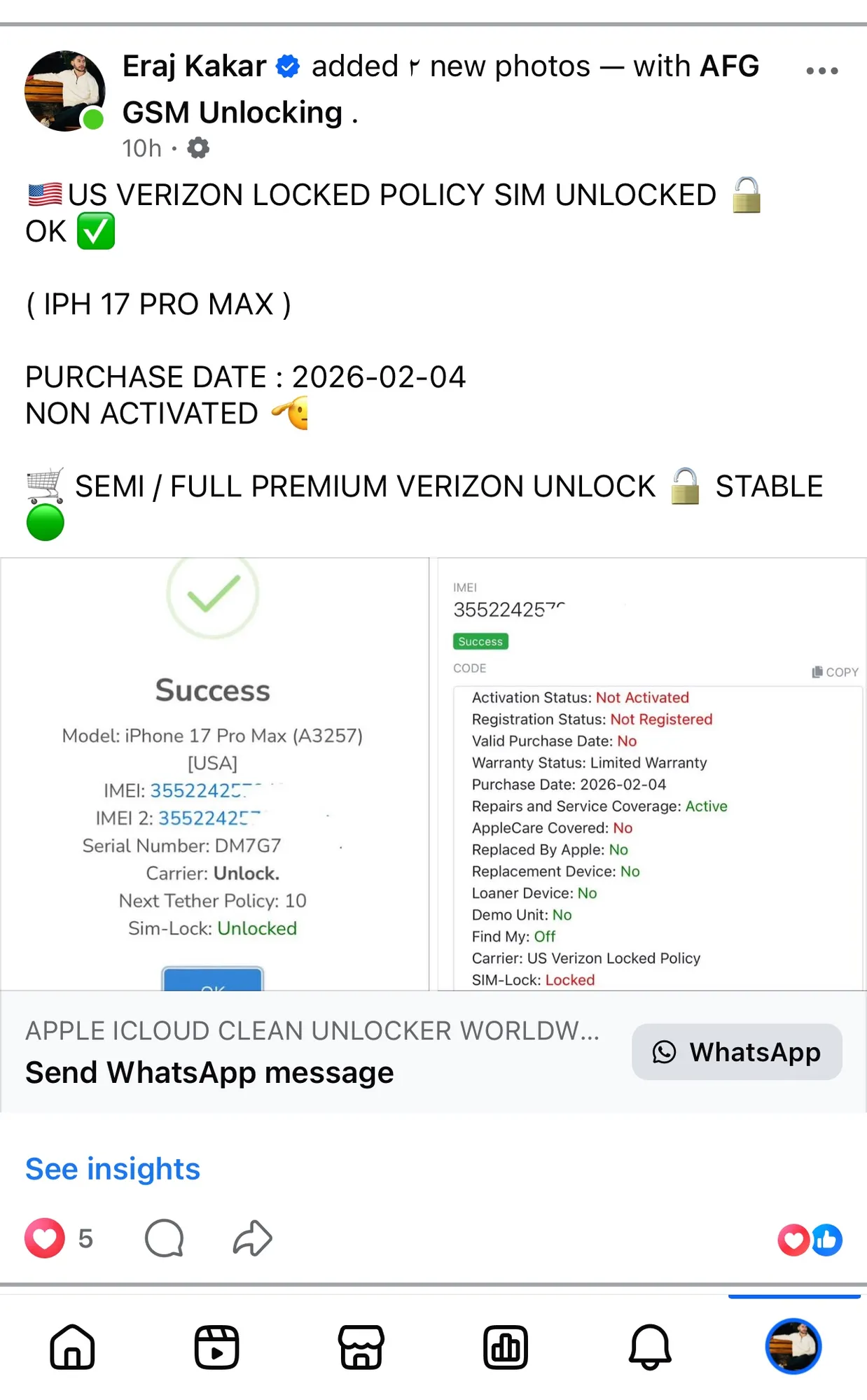 πΊπΈUS VERIZON LOCKED POLICY SIM UNLOCKED π OK β ( IPH 17 PRO MAX ) PURCHASE DATE : 2026-02-04 NON ACTIVATED π«‘ π SEMI / FULL PREMIUM VERIZON UNLOCK π STABLE π’